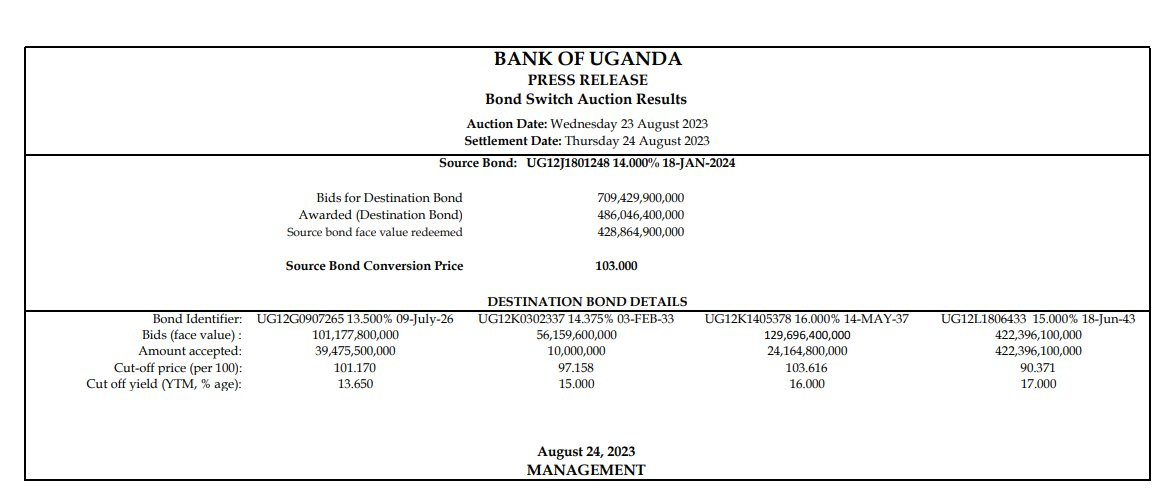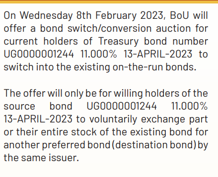 Image below shows the Bank of Uganda communications on Bond Switch.