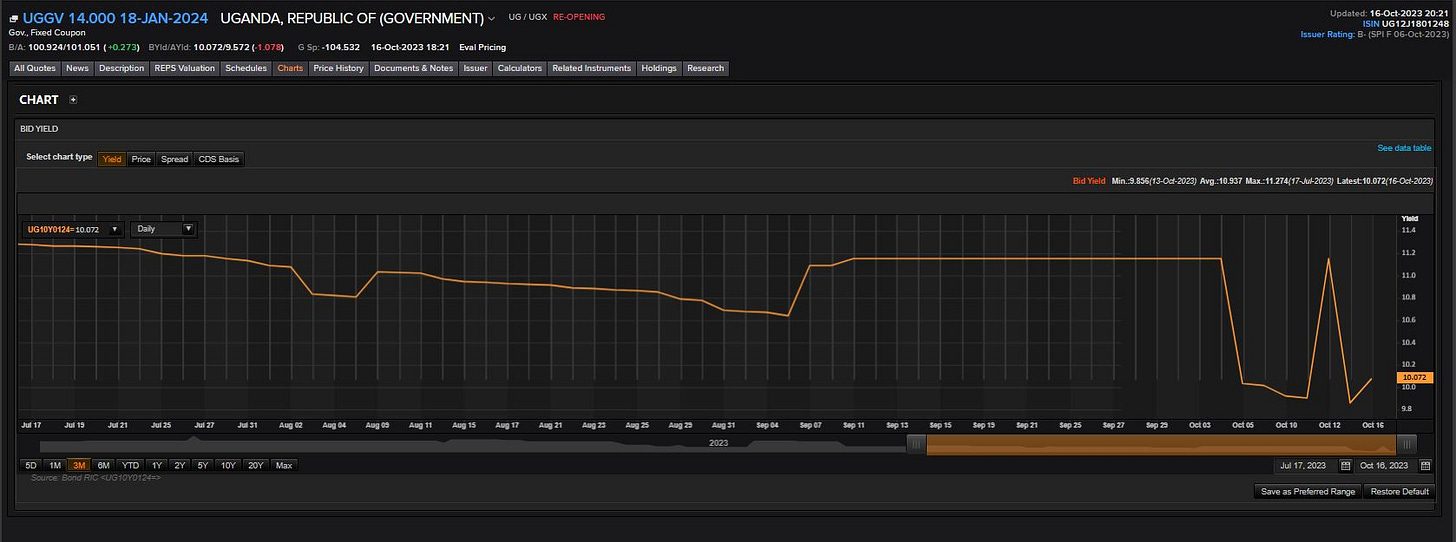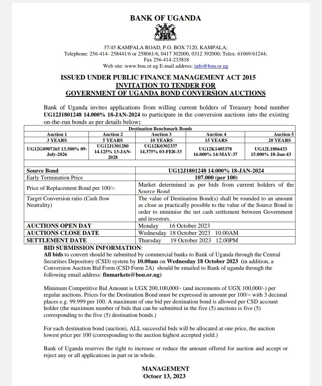 On October 16, 2023, the Bank of Uganda (BoU) issued a Call for Treasury Bond Switch scheduled for October 18, 2023. The affected Treasury bond is maturing in January 2024 and has a value of around UGX 1.2 trillion outstanding.